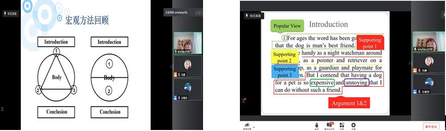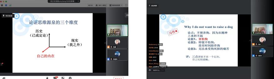 梁教授的讲座结束后,师生通过线上提问的方式与梁教授互动交流,对逻辑三原色的发展变体以及如何用逻辑三原色阅读理论书籍等进行了讨论。梁教授的讲座既帮助同学们意识到写作中逻辑的应用,也帮助老师们认识到如何在写作教学中“授人以渔”,在开阔视野的同时,进一步引发了师生对英文写作写与教的思考。