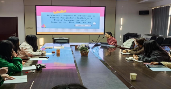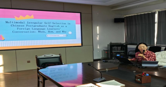 英语系吉蒙蒙博士做题为“Multimodal Irregular Self-Selection in Chinese Postgraduate English as a Foreign Language Learners’ Conversation: When, How and Why”的讲座,讲座由李霞博士主持,20余名师生参加。