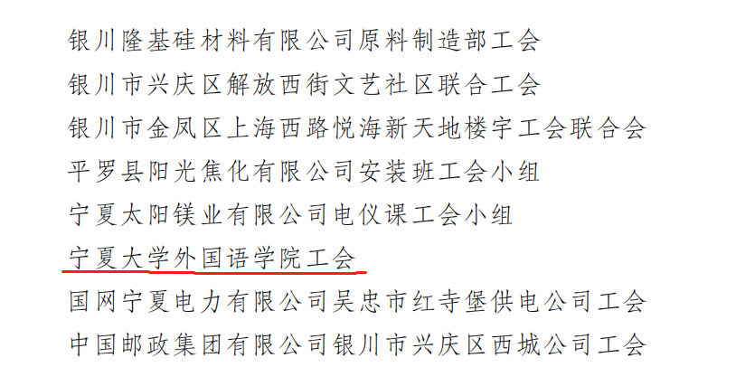 分工会连续10年荣获学校基层工会工作先进集体;先后荣获自治区“巾帼文明岗”、“五一巾帼奖状”、“全区模范教工小家”称号。