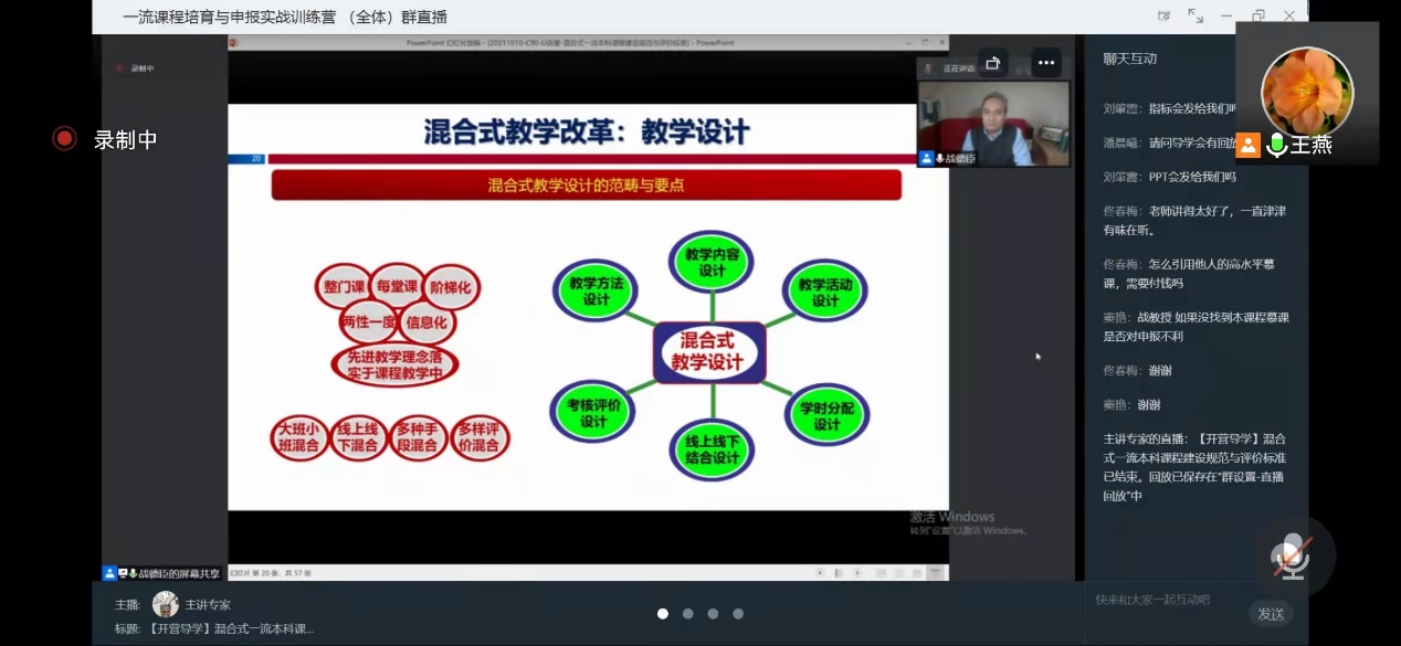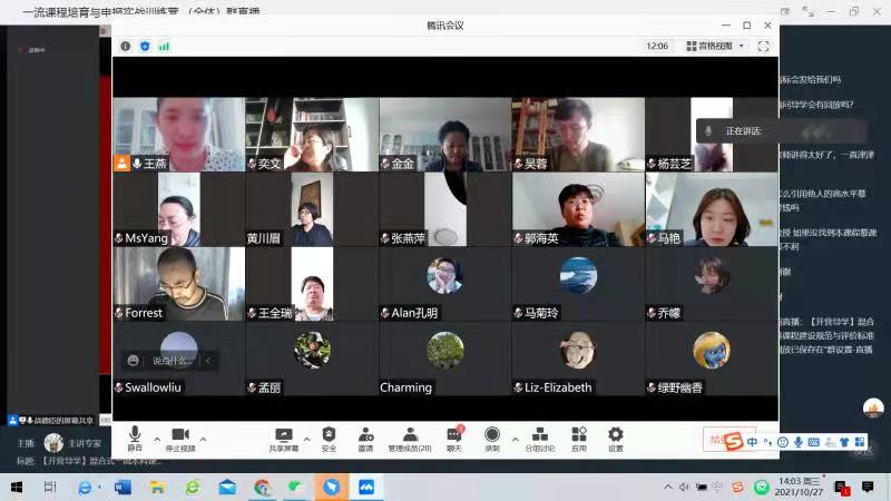英语系一流基层教学组织“语言与思辨教研室”于2021年10月27日下午2点,开展了线上教学活动,共同观看讲座“混合式一流本科课程建设规范及评价标准”,主讲人为哈尔滨工业大学教授,博士生导师战德臣。英语系语言与思辨教研室(一年级组)和语言与思辨教研室(二年级组)全体教师共同聆听本次线上讲座。