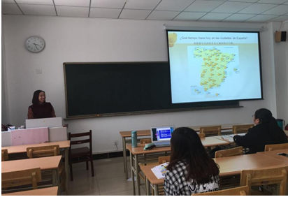 刘颖老师主要讲授天气这个内容,通过西班牙各大城市天气图片的展出导入主题,主要讲解了一些表示天气状况的句子和四季的表达。课程设计生动、大量运用图片能够吸引学生的眼球,达到了很好的教学效果。