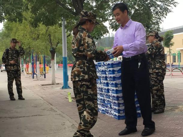 拜发奎书记在慰问中指出:同学们的军训生活即将结束,今年适逢宁夏回族自治区成立60周年暨宁夏大学60周年校庆,18级全体新生能够亲历是一件幸事、喜事。拜发奎书记看到同学们整齐有序的队列和良好的精神风貌,感到十分振奋,并且赞扬了大家在军训期间的优异表现。随后,拜发奎书记为同学们发放了慰问饮品。