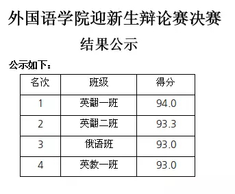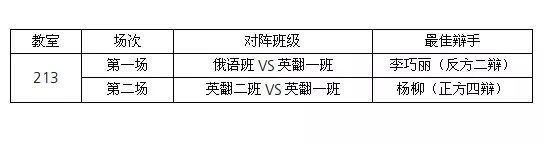经过攻辩、攻辩小结、自由辩论、总结陈词四个环节的激战,英语翻译一班以 94 分的高分取得本次辩论赛的冠军,紧随其后的是 93.3 分的英语翻译二班,俄语班和英语教育一班也取得了 93 分的优异成绩。比赛中英语翻译一班的杨柳同学和李巧丽同学分别凭借 95 分和 93.3 分的优异成绩赢得了最佳辩手的荣誉称号。