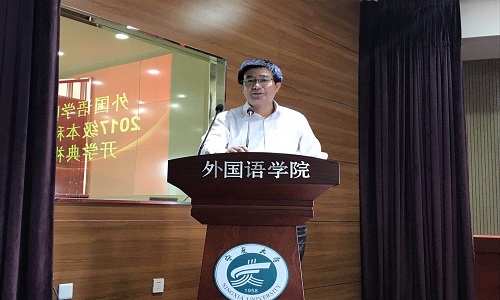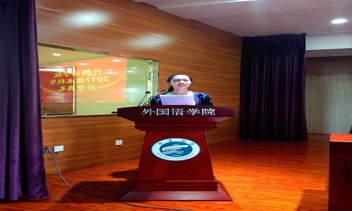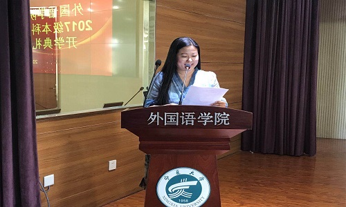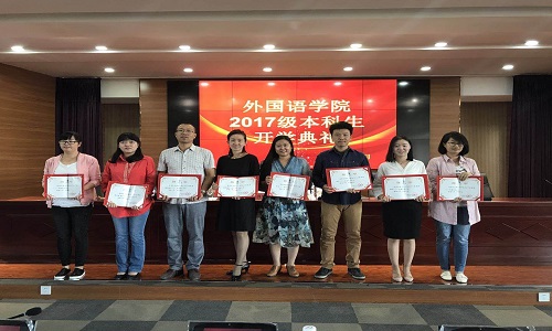 关于聘任宋晓龑等八名教师担任2017级兼职班主任的决定》,并由院领导向老师颁发聘书。紧接着,2017级英语专业学生陆美彤同学代表2017级新生发言。在发言中,她表达了自己对大学生活的美好期盼和入学感想,并向同学们发出“团结同学,尊师向学”等倡议。随后,由2014级英语专业学生、院学生会副主席刘淑君代表老生发言。她讲述了自己的心得体会并对新生送出美好祝愿。紧接着,教师代表金丽华老师发言。她以流利的英文向新生表示欢迎,在发言中,她说到“They say a person needs three things to be truly happy in this world:someone to love,something to do,and some vision to hope for.”令大家陷入沉思,受益匪浅。