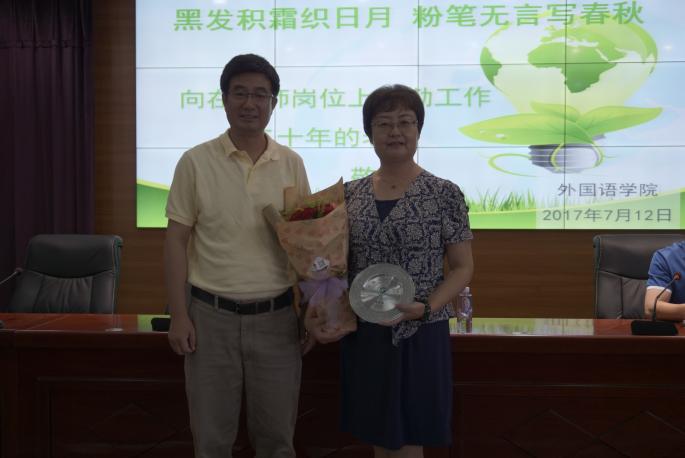 关于为教龄满三十年教师颁发纪念奖章的决定。伴随着欢快的歌声,周震院长向15位老教师逐一颁发纪念奖章并与他们合影留念。