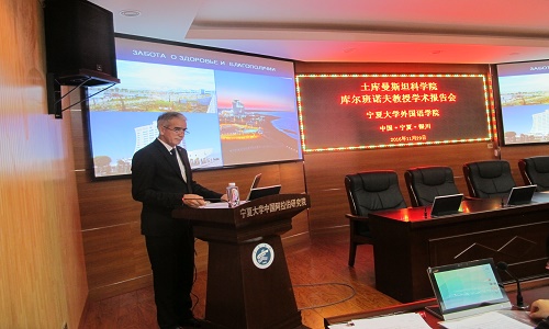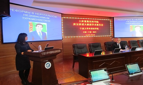库尔班诺夫教授从“土库曼斯坦的独立之路”说起,并结合当今实事和图片信息,详细介绍了土库曼斯坦独立之后在教育科学、农业、工业等方面做出的改革,其后重点阐述了该国的交通系统、医疗保障福利,以及当今土库曼斯坦在国际政治、经济、文化等领域里取得的重大成就,使大家对该国独立以来的改革和现状有了直观的认识。在接下来的自由提问环节,参会的师生积极发问,与库尔班诺夫教授进行了相关问题的探讨,如:土库曼斯坦国内如何看待中国的改革、土库曼斯坦对“一带一路倡议”的看法以及俄语在当今土库曼斯坦的地位等。库尔班诺夫教授针对以上问题分别做了详细、热情的阐述。