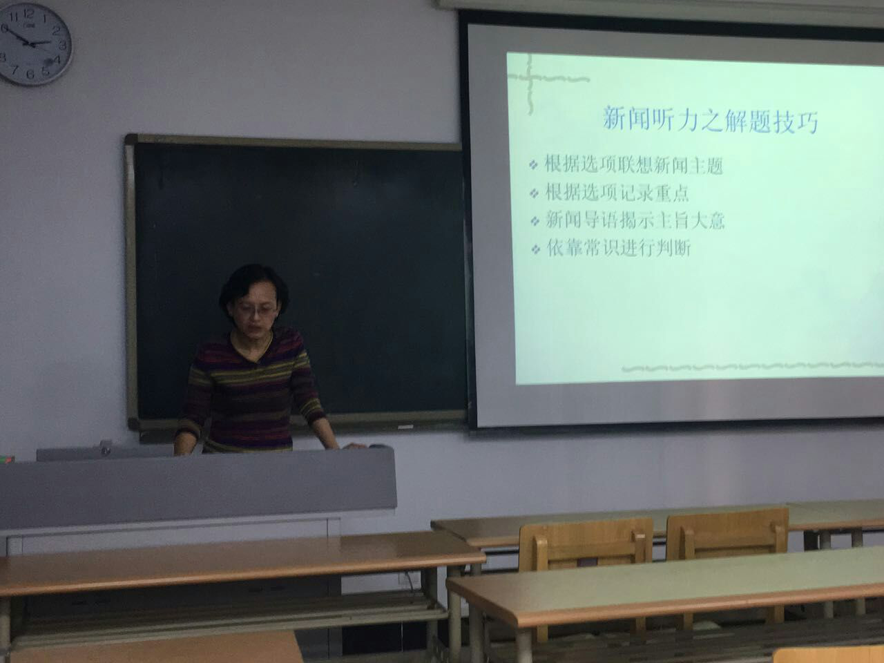 大学英语四级考试专题讲解主题活动包括分模块教学经验交流环节和集体讨论环节。在第一环节中,郑晓英老师就四级写作技巧、三种类型作文及作文改错方面同各位老师进行交流;韩芳老师就四级听力的题型分值和解题技巧与策略进行了讲解;赵晓娥老师、杨晓丽老师、以及杨胜兰老师分别就阅读试题中的选词填空、长篇阅读、传统阅读技巧进行了经验交流;张静老师分享了四级翻译题型的教学方法。之后,各位老师就大学英语四级题型解题技巧和方法进行了交流和讨论,教研气氛活跃,老师们均表示获益匪浅。