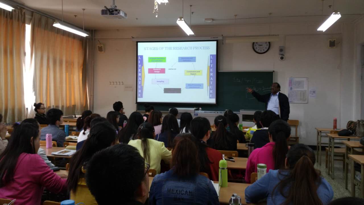 9月29日上午为2016级研究生英语一班的同学们进行了主题为"How to go tothe research" 的讲座。Arsaythamby Veloo 教授从如何进行广泛阅读之后确定“topic, title, 和focus”开篇,然后就“Quantity和 Quantitative”两种研究方法中的“取样“和“数据采集”与同学们进行了互动交流。在为2016级教育捕鱼大玩家
