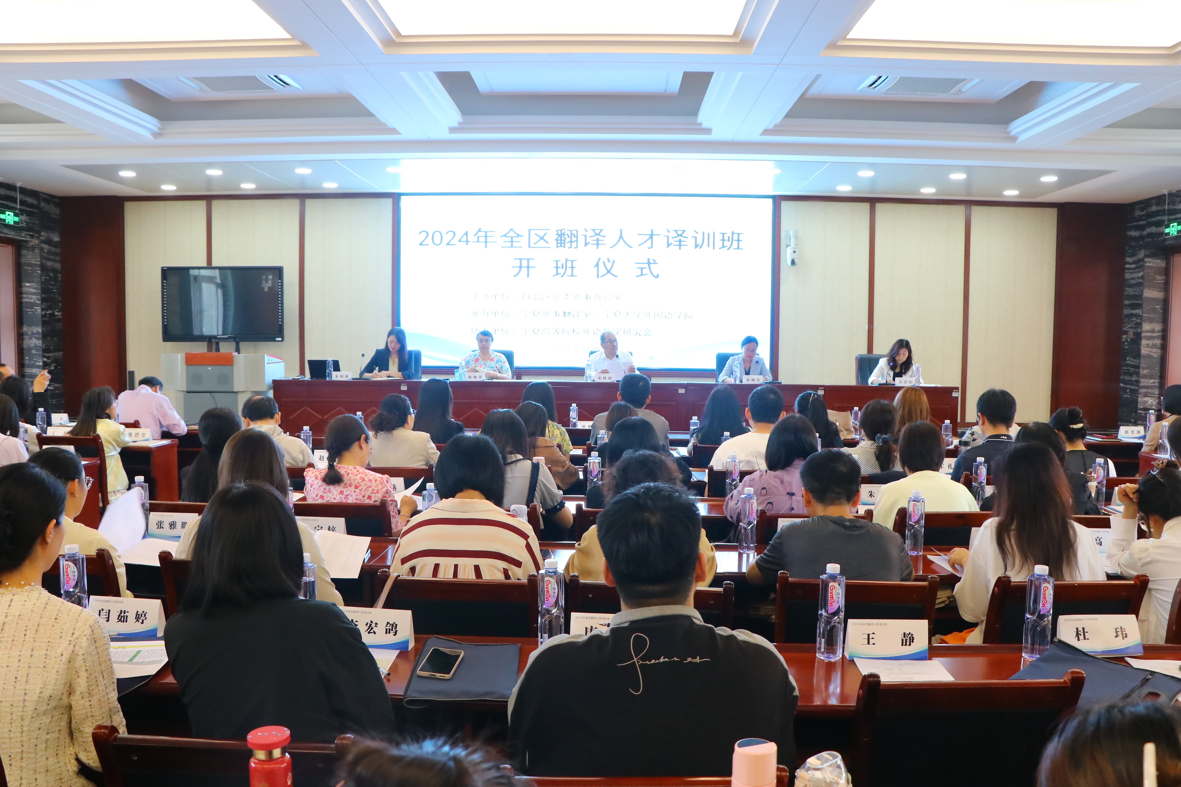 承办,宁夏高等院校外语教学研究会协办的2024年宁夏回族自治区翻译人才译训班在宁夏大学怀远校区逸夫楼一楼报告厅正式开班。本次培训班汇聚了来自宁夏回族自治区党委外事工作委员会成员单位、五市涉外系统、国企的英语干部以及高校英语骨干外语教师近100人,共同开启为期三天的系统翻译学习之旅。