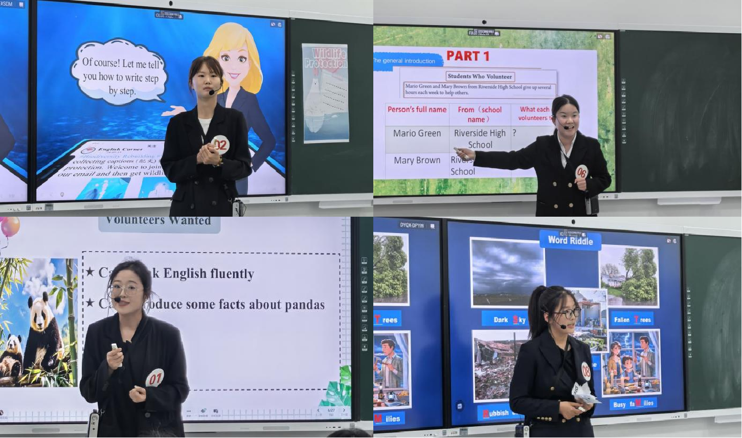比赛内容包括教学设计、模拟课堂两个部分。参赛选手从《人教版初中英语八年级》下册任选一课时,进行课堂教学设计和15分钟的模拟授课。选手授课课型丰富多样,包括听说、阅读、写作课。他们能够依据初中英语课程标准,从语言能力、文化意识、思维品质、学习能力四个方面确立教学目标,并依据教学目标创设情境,设计一系列由低阶到高阶的英语活动,帮助学生完成听、说、读、写的任务。在讲语言技能的同时,润物细无声地对学生进行思政教育,引导学生深入理解“有志者事竟成”、“灾难面前团结一致”、“保护濒临灭绝动物”等主题。在教学创新和信息技术方面,选手们首次运用人工智能技术辅助教学,这不仅展示了现代科技在教育中的应用,还增强了课堂的互动性和趣味性,充分体现了当代大学生对教育创新的追求。
