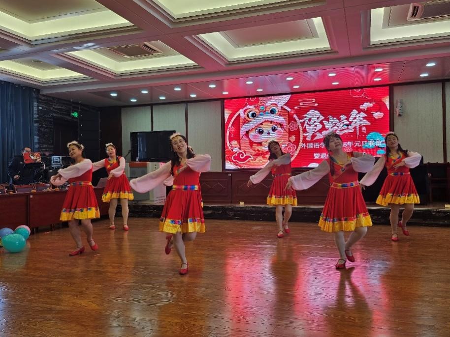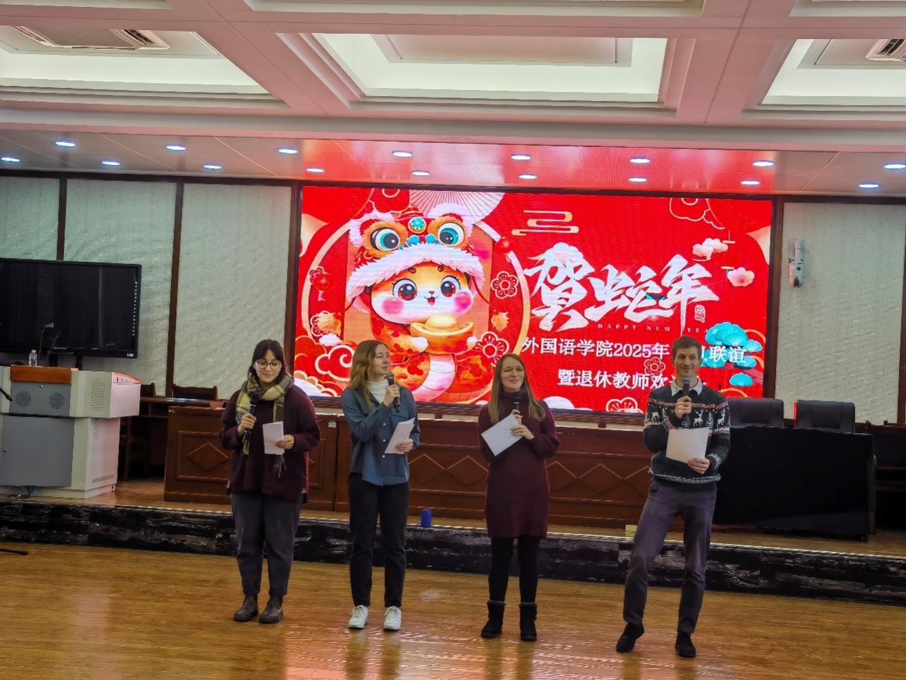 在老师们热情的欢呼声中,联谊会正式拉开帷幕。在“恭贺蛇年”的大背景下,几位研究生代表带来了激情四射的开场舞。动感有力的舞步,瞬间将现场观众的热情点燃。接着,有马真老师的男声独唱《游牧时光》、有唯美的舞蹈《娥嫚》、有外教老师的歌曲表演、有捕鱼大玩家