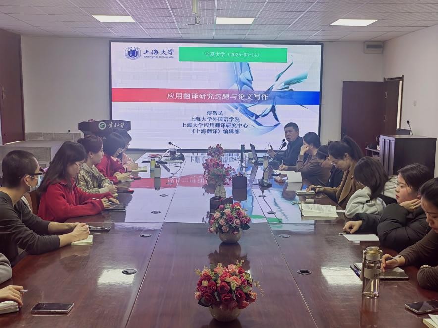 讲座伊始,傅敬民教授简要介绍了当前我国翻译研究的现状与发展趋势,围绕翻译研究前沿议题、应用翻译研究体系,以及翻译研究学术论文的选题、写作步骤与规范等方面进行了深入阐述。傅敬民教授结合我校学科特色,重点探讨了枸杞书写与翻译传播研究及其在应用翻译领域的研究价值。