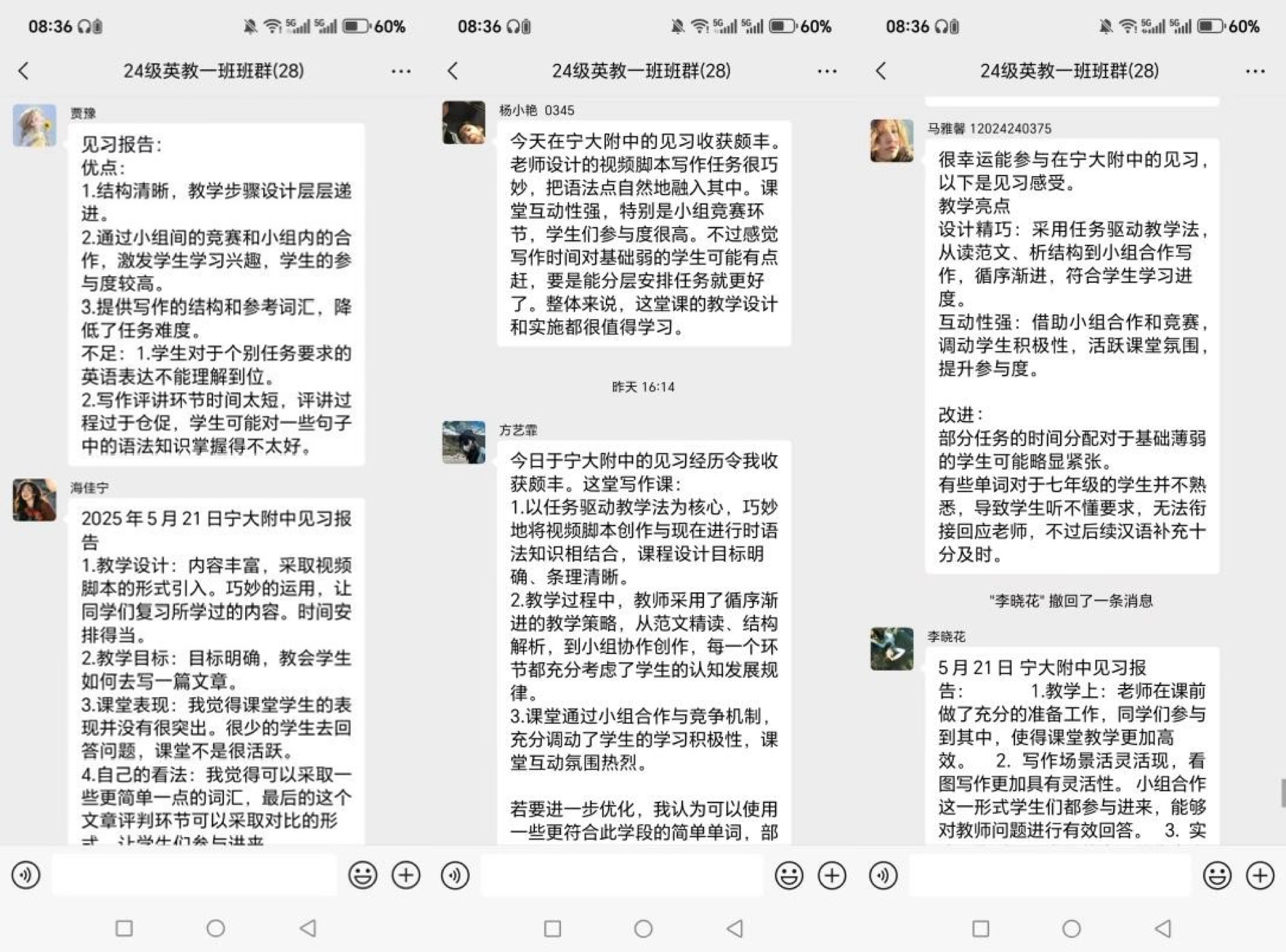 本次见习活动的开展获得较好反响,师范生在掌握基本教学流程和相关教学技巧的同时,能将平时的理论学习与教学实践相结合,提升对教师职业的理解,内化相关技巧与方法,为未来迈入教师岗位奠定基础。观摩后的讨论与分析进一步激发了师范生对如何上好一堂英语课的深刻反思。