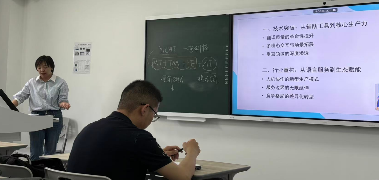 刘颖老师从 “技术突破、行业重构、伦理挑战与可持续发展、未来展望:人机共生的翻译新生态”四个层面进行发言,系统梳理了机器翻译、CAT工具、语音识别等技术的发展脉络,分析技术在提升翻译效率、保障术语一致性等方面的应用价值,同时强调“技术是助手而非替代”,译者的文化理解与审美判断仍不可取代。
