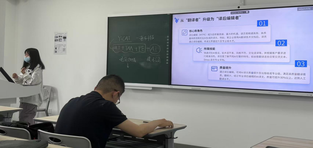 2024级翻译硕士分享了他们在使用MemoQ、DeepL等工具完成翻译项目的经验,坦言技术让“译前术语管理更精准、译中协作更高效”,但也提出“如何在技术辅助下保持译文文学性”的困惑。也有同学聚焦AI生成内容的伦理问题,结合国际翻译界关于“AI翻译署名权”的争议,呼吁建立技术应用的行业规范。