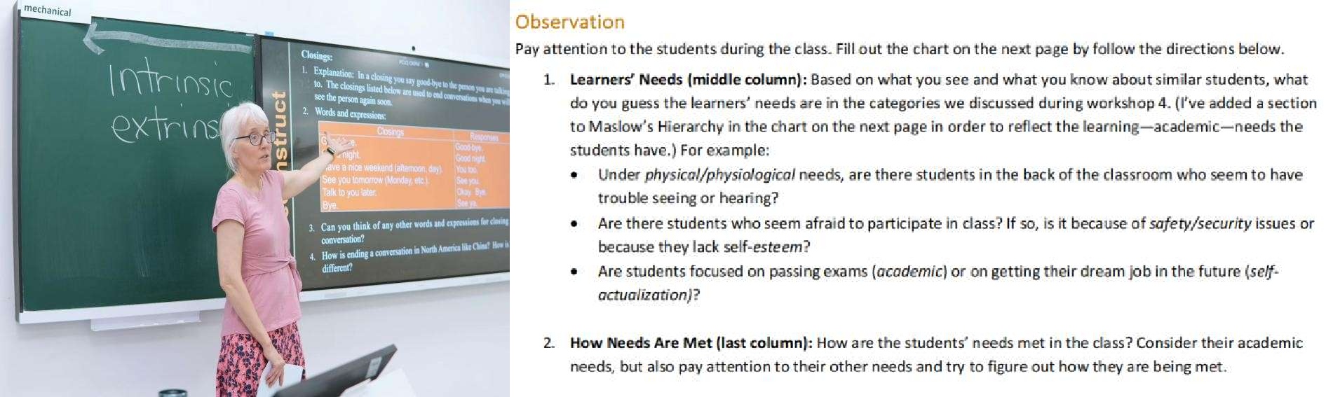 活动基于卓越班同学一周前观摩的小学英语课。在Melissa老师的指导下,同学们借助课堂观察量表对这堂课进行了记录。该量表将学习者需求细分为三大类别、六个递进层次,要求观摩学生记录课堂中学习者各项需求的具体体现及教师的应对策略。课后,同学们将观察数据整理成需求层级结构图(Hierarchy),并撰写了反思日志,重点剖析了“哪些需求被满足/忽视?”以及“如何助力后进生快乐高效学习?”两大关键问题。