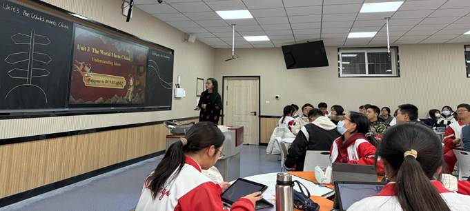 师范生们认真观摩、细致记录,对教师在课堂中运用的“全英沉浸式教学”“情境教学”及“多媒体融合”等教学策略印象深刻。观摩结束后,班主任宋晓龑老师带领参与本次见习活动的学生进行教学研讨,师范生围绕本节课的教学设计、课堂实施与教学效果进行多角度剖析。有同学注意到张老师采用了“先泛读把握整体,再精读聚焦细节”的阅读教学路径,她认为这种循序渐进的安排符合学生的认知规律,有助于学生逐步构建对文本的理解。另有同学则进一步补充,他认为本课的泛读环节设计尤为出色,通过快速浏览、预测等策略,有效激活了学生的背景知识,为后续的精读活动做好了铺垫。多位同学对课堂活动的多样性与现代教育技术的应用表示赞赏。有同学指出,教师不仅运用了小组讨论、情景模拟等丰富形式,其PPT课件制作精良,关键信息突出显示,配合敦煌壁画的高清图片和短视频,营造了沉浸式的学习氛围,给人耳目一新之感。还有同学观察到,张老师在处理重难点词汇时,并非孤立讲解,而是结合课文语境引导学生跟读和体会,并在学生发言后能进行精准的总结与提升,体现了良好的课堂互动与语言产出。同学们特别钦佩张老师本身的专业素养。大家谈到,张老师口语流利,教态亲切自然,面对学生的不同反应能够灵活应对,其即时、具体、富有鼓励性的课堂评价有效激发了学生的参与热情。在同学们分享讨论环节后,宋老师在总结中指出,此次研讨不仅在于评课,更在于引导同学们将观摩实践与所学理论相印证,反思如何将优秀教师的教学智慧转化为自身成长的养分。她鼓励同学们今后在教学设计中,要像张老师一样,注重文本的深度解读、活动层次的递进以及育人价值的自然渗透。